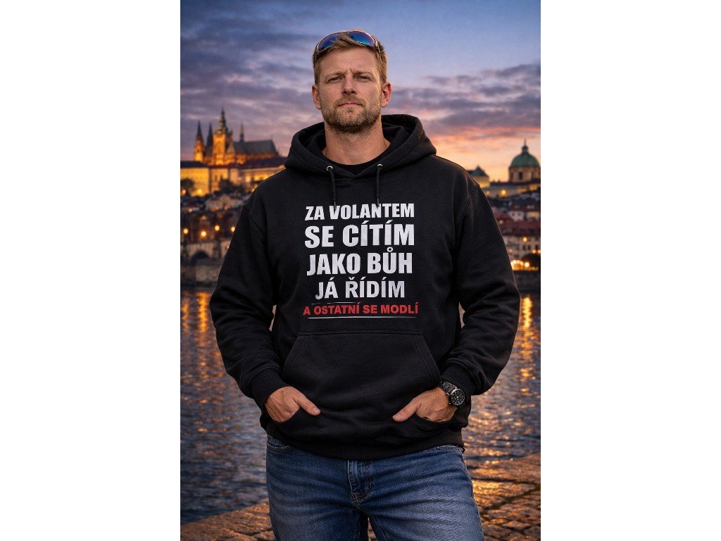 Pánská vtipná mikina - ZA VOLANTEM SE CÍTÍM JAKO BŮH,JÁ ŘÍDÍM A OSTATNÍ SE MODLÍ