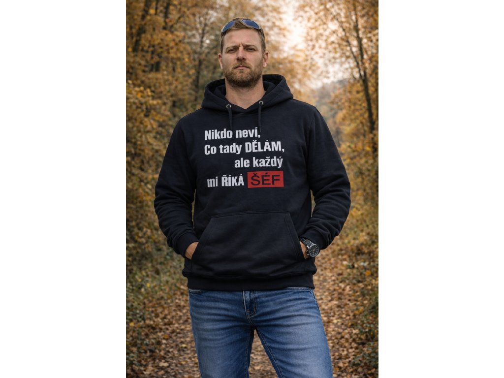 Pánská vtipná mikina - NIKDO NEVÍ CO TADY DĚLÁM,ALE KAŽDÝ MI ŘÍKÁ ŠÉF