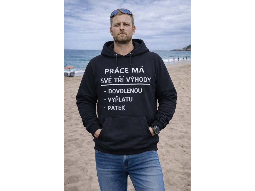 Pánská vtipná mikina - PRÁCE MÁ SVÉ TŘI VÝHODY-DOVOLENOU,VÝPLATU,PÁTEK